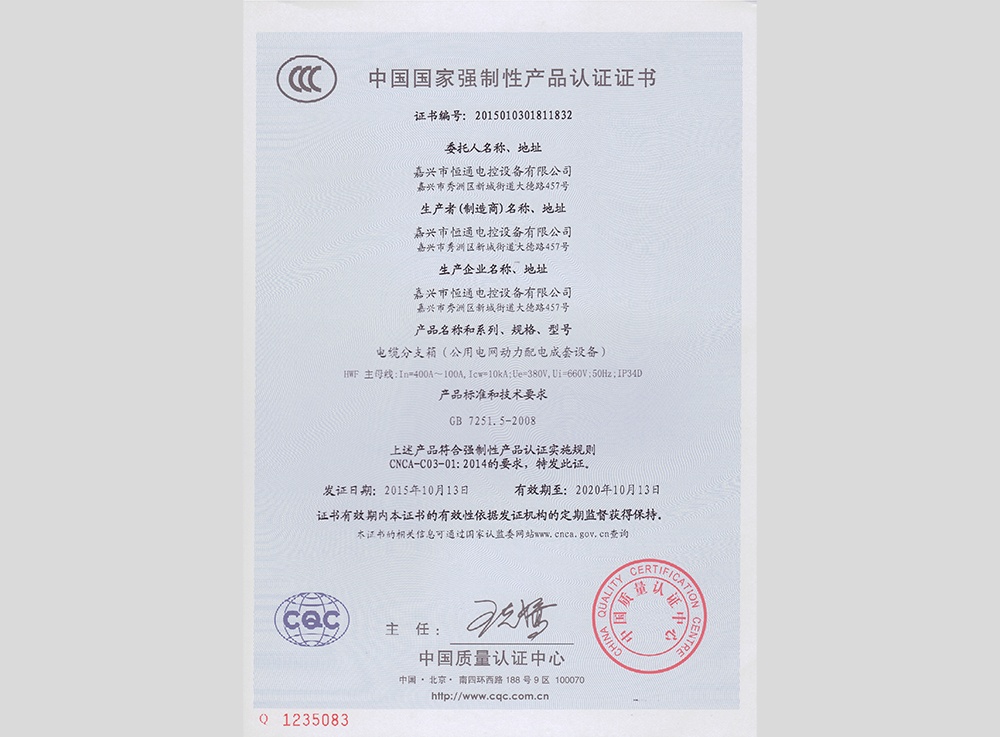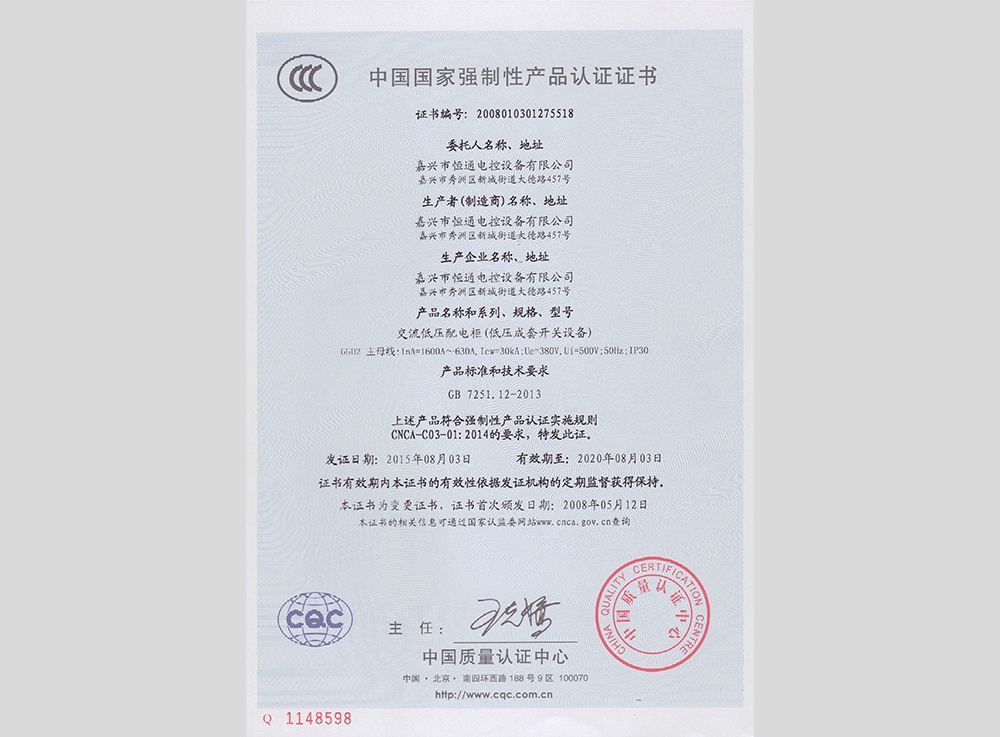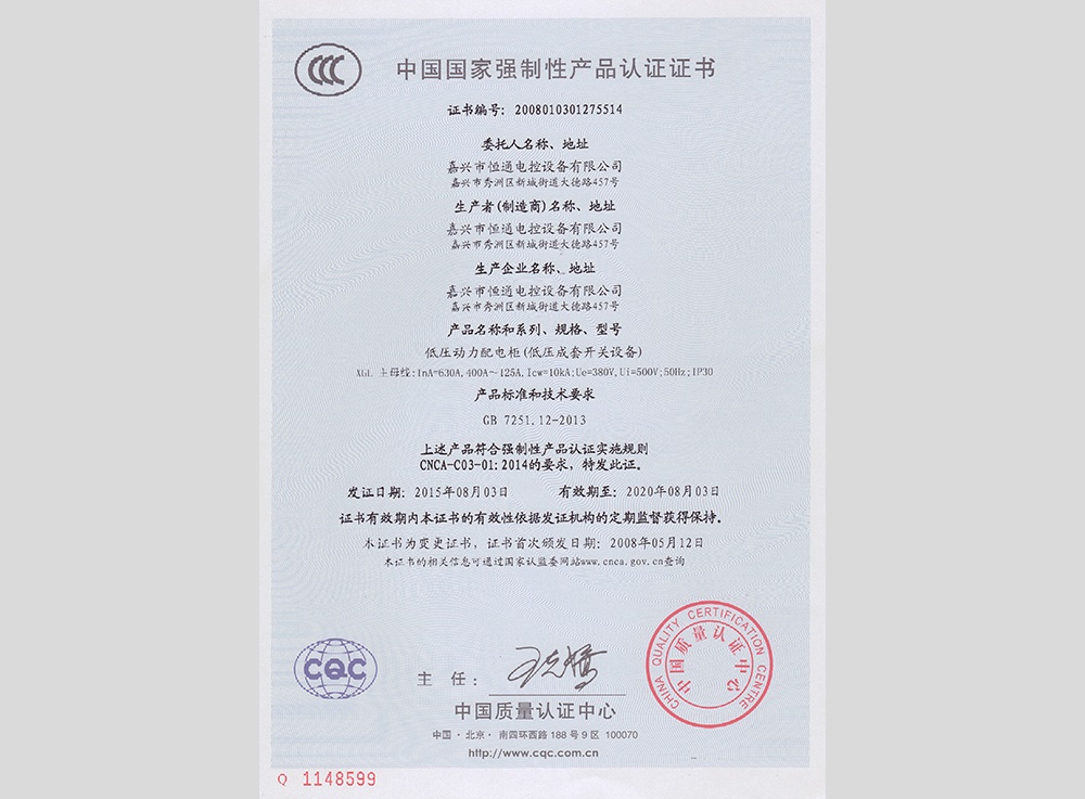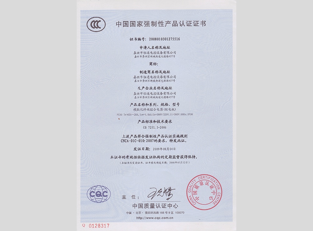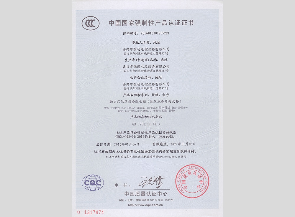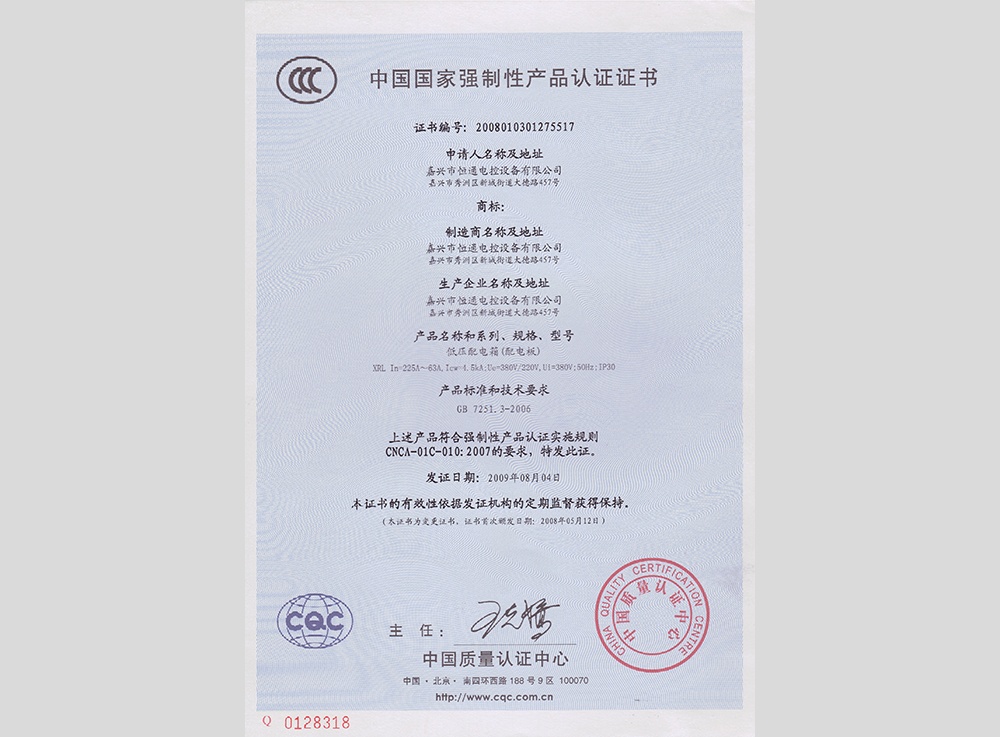 認領(lǐng)"3C"證書(shū)及型式試驗報告,產(chǎn)品分別有:高低壓 箱式變電站XBW、高壓中置柜KYN28、抽出式低壓 成套配電柜MNS、低壓抽出式開(kāi)關(guān)柜GCS、低壓配 電柜GGD、電容補償柜GGJ、母線(xiàn)槽CMC、集控表 箱XRC、玻璃鋼集控表箱XRD、低壓動(dòng)力柜XGL、電 纜分支箱HWF、低壓配電箱XRL、模數化照明箱PZ30。